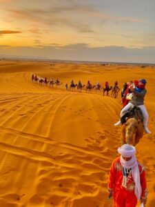 Afternoon camel ride into the dunes to witness a magical sunset.